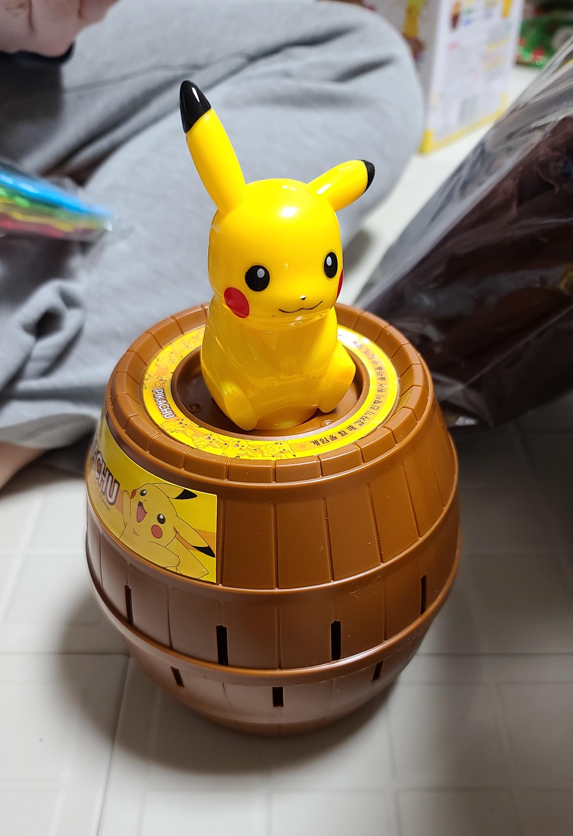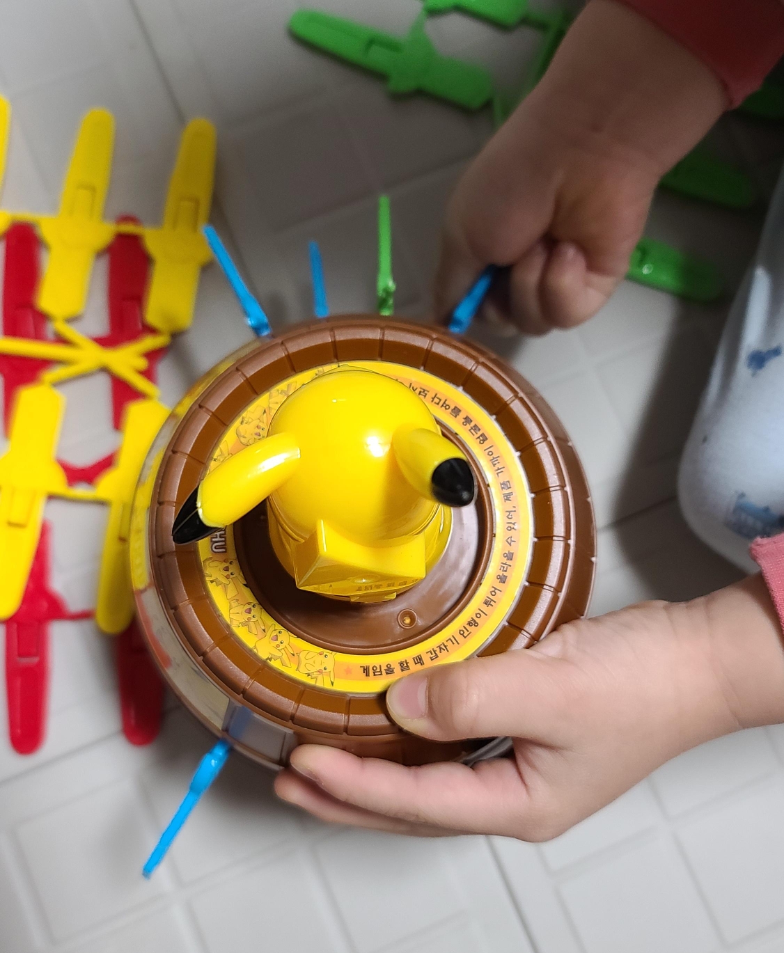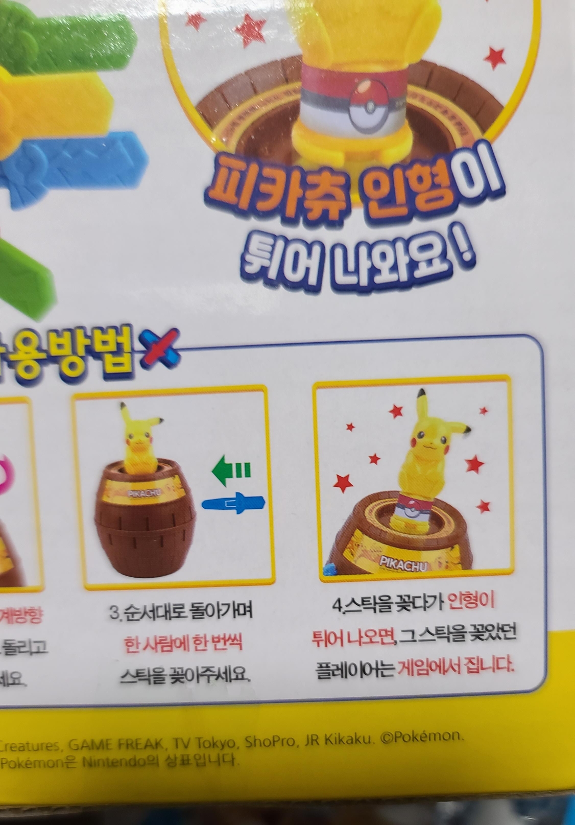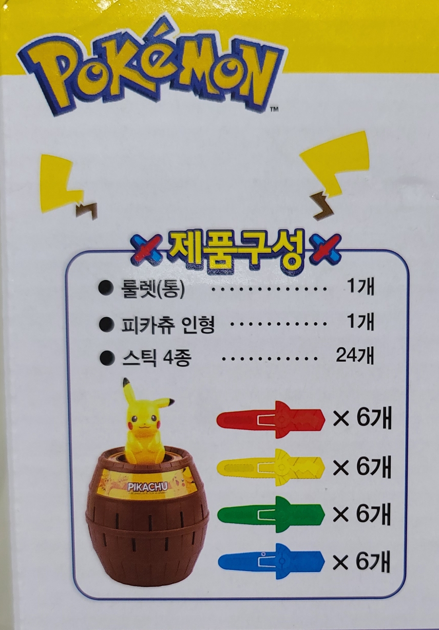 통나무 통에 있는 구멍에 스틱을 순서대로 넣으면 어느 한 개를 넣었을 때 피카츄가 슝 하고 튀어나오는 게임이에요. 걸린 사람이 벌칙을 받는 거죠 ^^