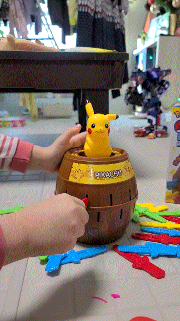통나무 통에 있는 구멍에 스틱을 순서대로 넣으면 어느 한 개를 넣었을 때 피카츄가 슝 하고 튀어나오는 게임이에요. 걸린 사람이 벌칙을 받는 거죠 ^^