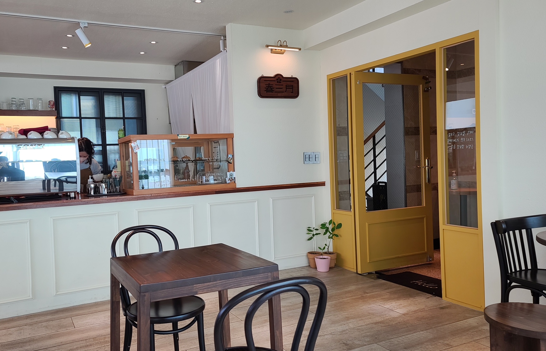 내부는 화이트톤과 우드로 깔끔한 분위기를 연출했다. 나무에 새긴 춘삼월 명판도 독특하다.