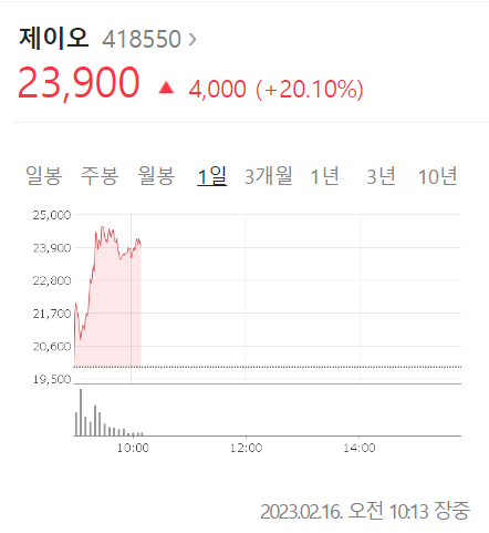 오전 10시 13분 기준, 제이오의 주가는 23900원입니다.
