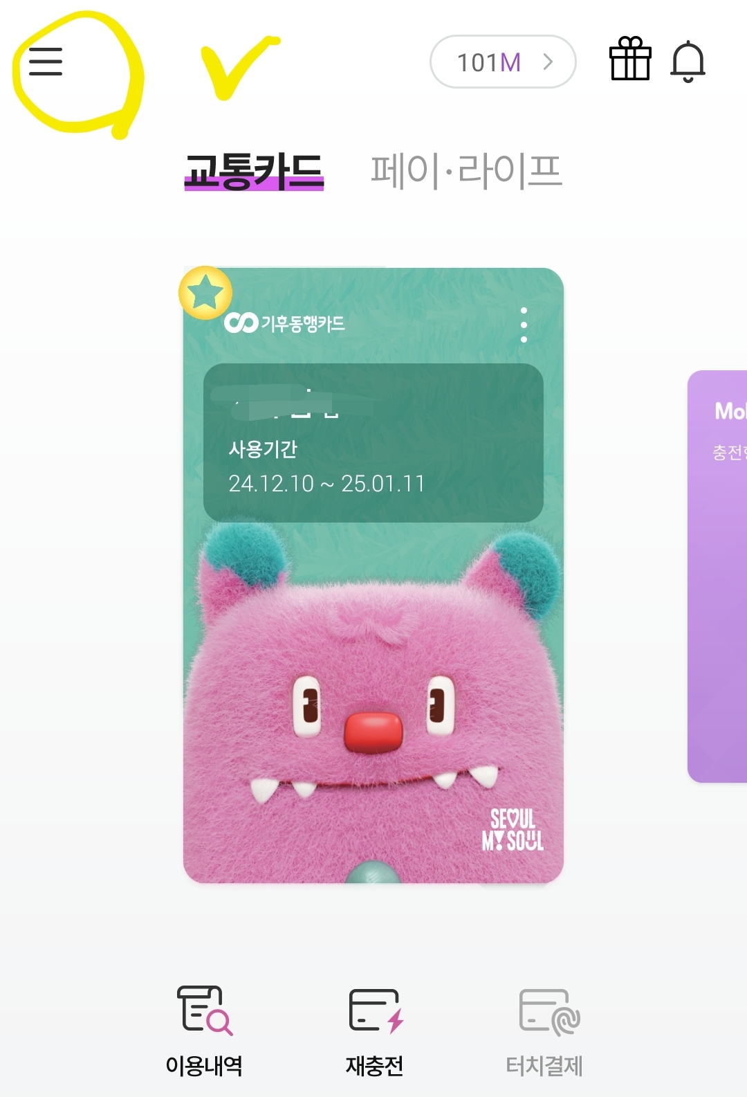 3. 기후동행카드가 보이죠? 상단 왼쪽 귀퉁이의 三을 눌러 메뉴를 열어주세요.