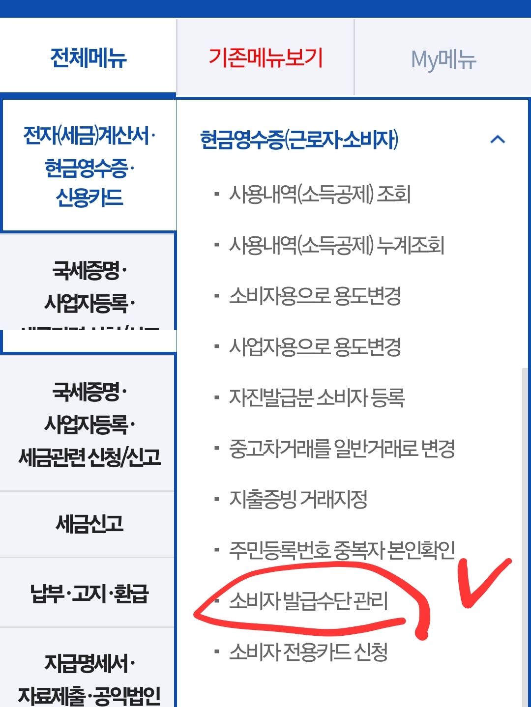 8. 이제 다 왔어요. 메뉴가 주루룩 나오면 '소비자 발급수단 관리'를 눌러 들어가요.