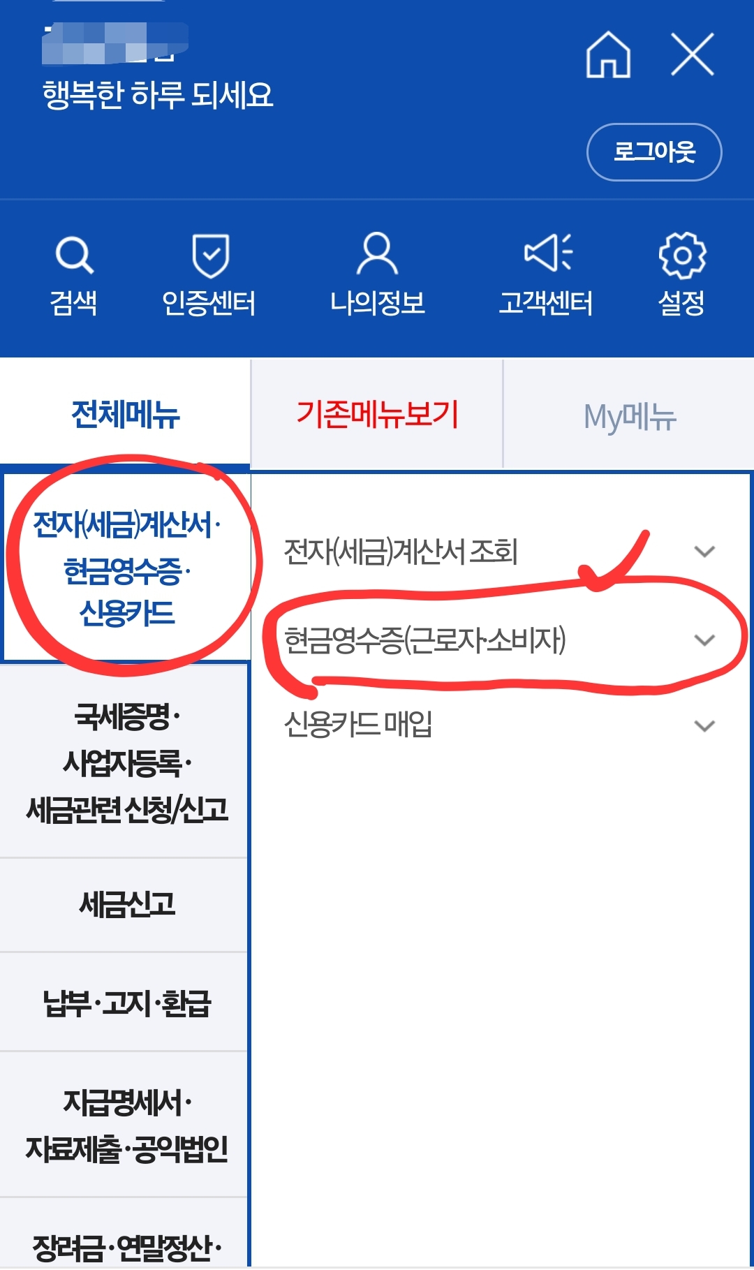 7. 전체메뉴에서 전자(세금)계산서, 현금영수증, 신용카드 메뉴를 누르면 위와 같이 나와요. 이 중 '현금영수증'을 눌러요.
