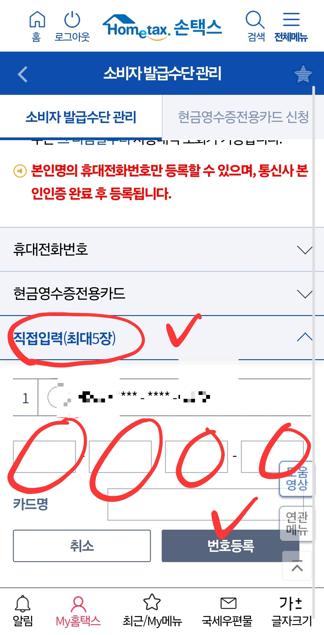 9. 저는 현금영수증 실물카드가 있어서 하나가 이미 등록돼 있어요. 아래 4개의 빈 칸에 아까 모바일 티머니에서 확인한 기후동행카드의 카드번호를 입력해주세요. 그후 '번호등록'을 누르면 돼요.