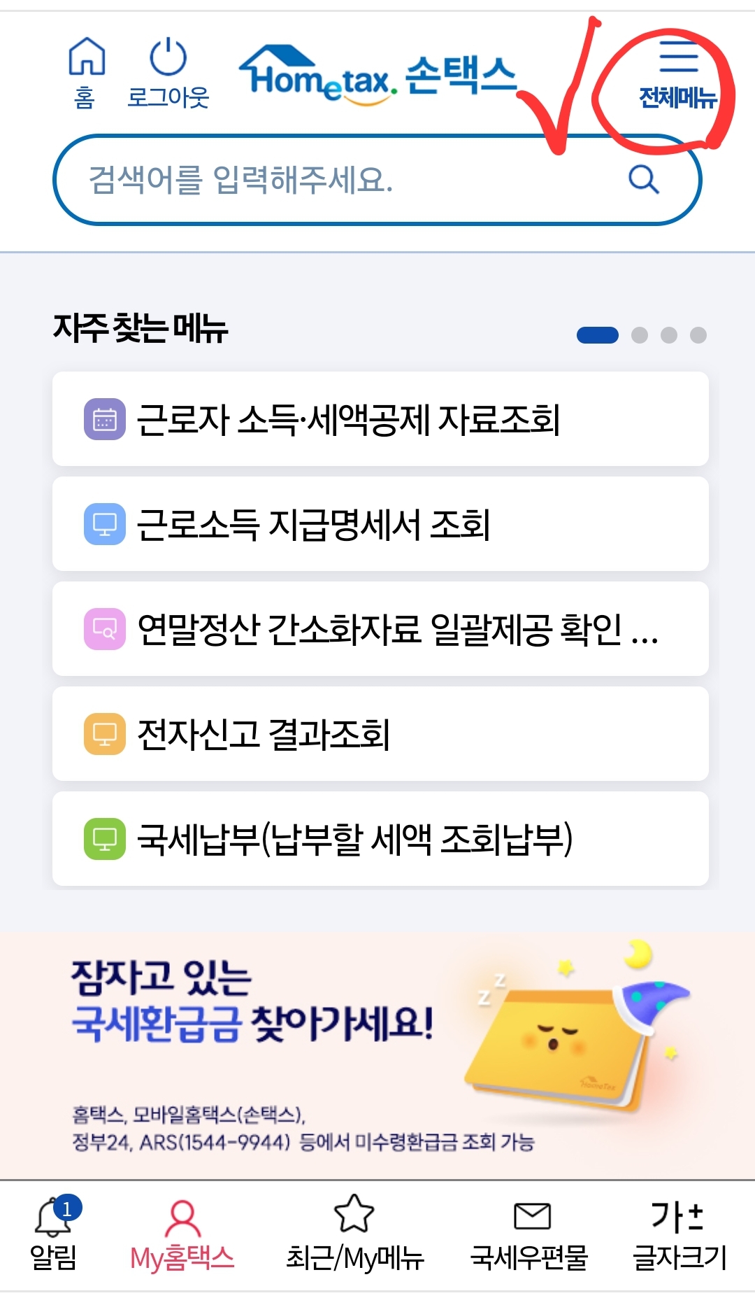 6. 로그인 했다면 상단 오른쪽 메뉴의 三을 눌러 '전체메뉴'로 들어가요.