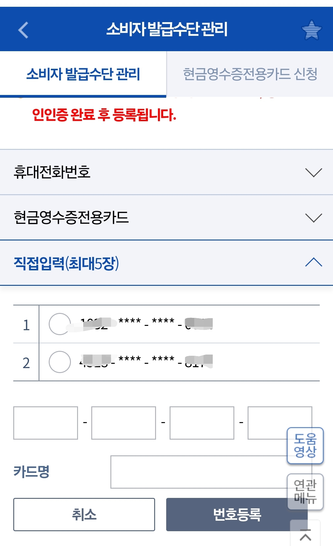 9. 저는 현금영수증 실물카드가 있어서 하나가 이미 등록돼 있어요. 아래 4개의 빈 칸에 아까 모바일 티머니에서 확인한 기후동행카드의 카드번호를 입력해주세요. 그후 '번호등록'을 누르면 돼요.